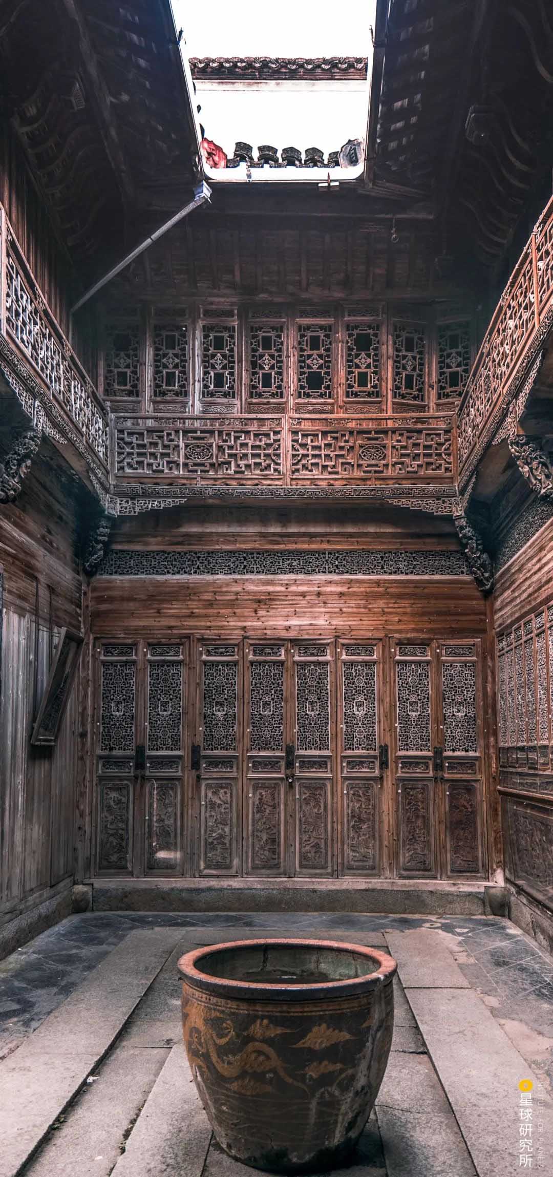 在雨天,雨水順著四周傾斜的屋頂,匯入天井,是為“四水歸堂”,寓意“肥水不流外人田”,不知從前是否有佳人,倚著美人靠,靜默聽雨。