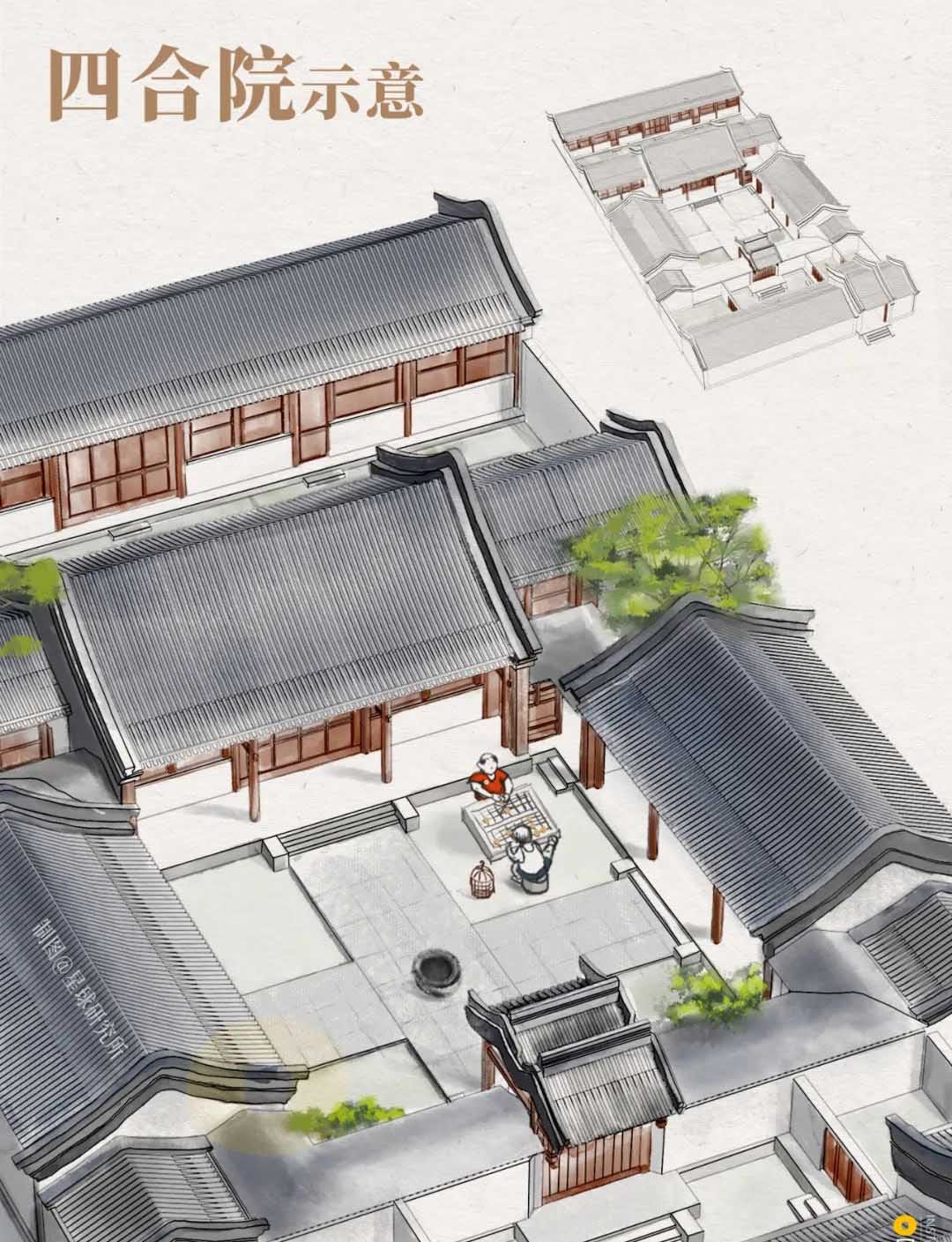 其次,是附著于結(jié)構(gòu)之上的,建筑形式的融合,移民們參照當(dāng)?shù)?,干欄式建筑的“樓居”形式,將原本平鋪在地面上的,四合院建筑抬升?-3層,一般來說,一層中間布置廳堂。