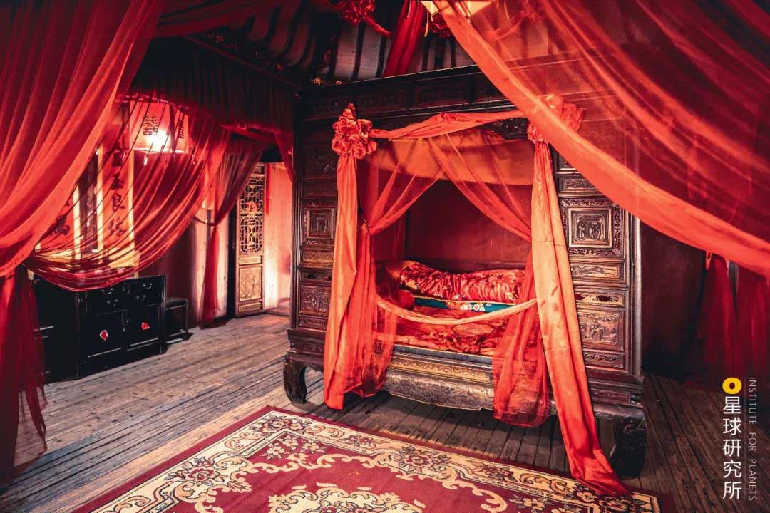 (婺源篁嶺民居中的二樓臥室,被用作婚房,徽州民居其實(shí)經(jīng)歷了一個(gè)漫長(zhǎng)的形成過程,明代的民居二樓為廳堂,稱“樓上廳”,更多的保留了干欄式建筑的特色,清代的主要廳堂則由二樓轉(zhuǎn)移到一樓,攝影師@鄭哲文)