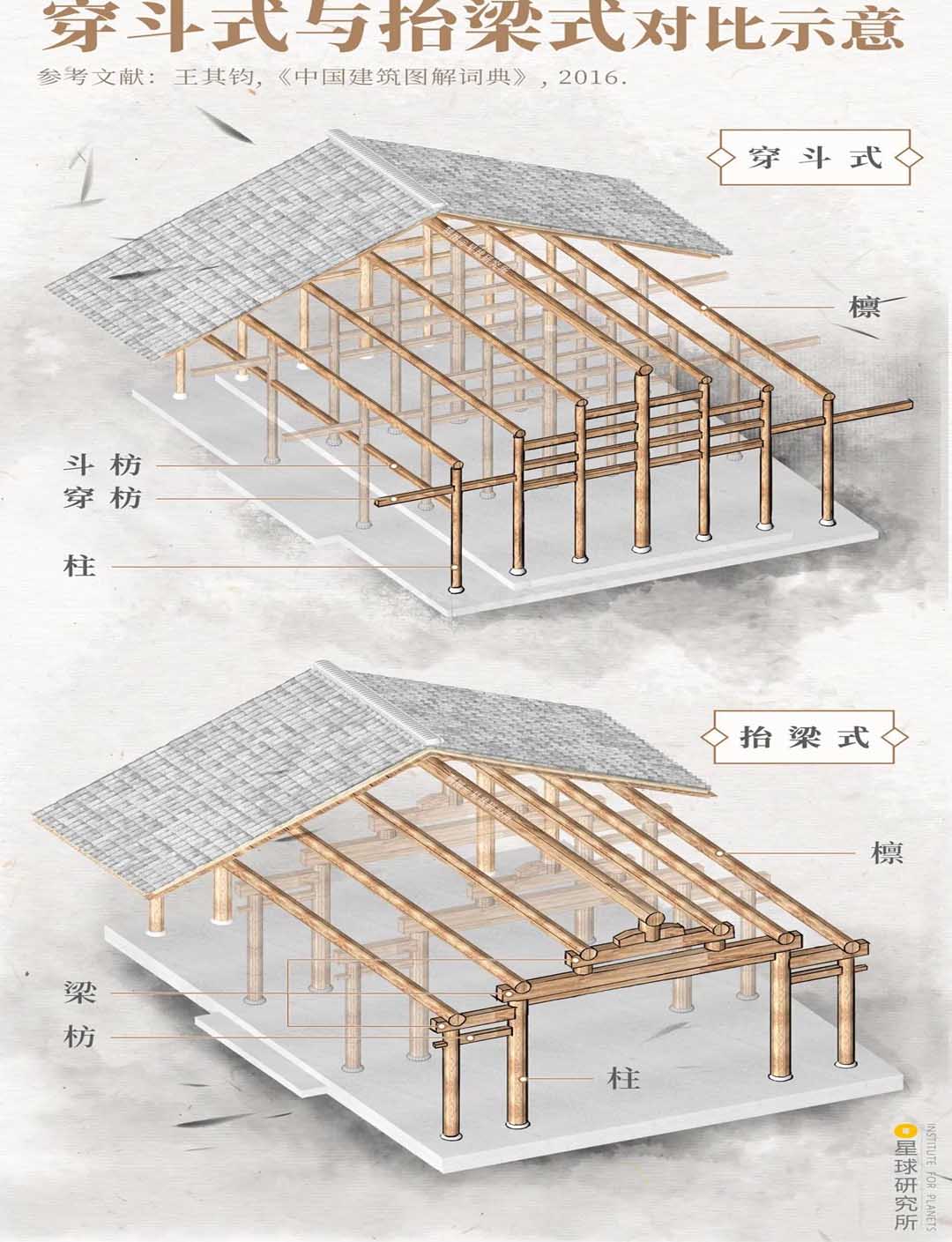 (穿斗式與抬梁式對(duì)比示意,檁條直接放置在柱子上,再用穿枋和斗枋連接為一個(gè)整體,是為穿斗式;柱上放梁,梁上架檁,柱子將梁層層抬起,是為抬梁式,制圖@王申雯/星球研究所)