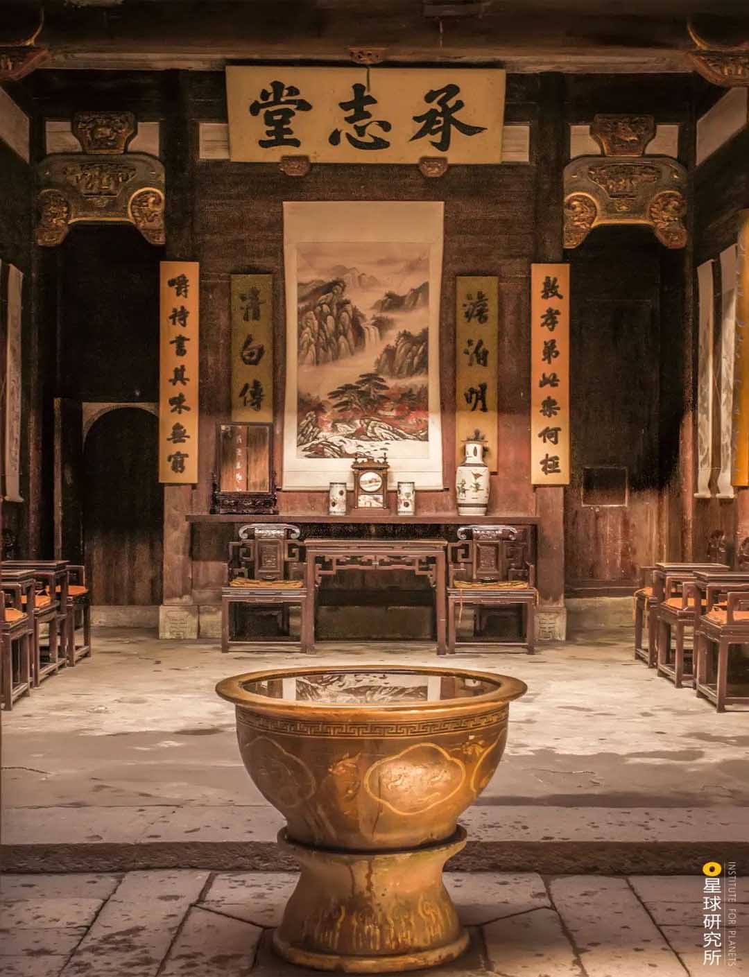 (宏村承志堂,徽州的廳堂一般題有堂名,掛有代表家訓(xùn)的對(duì)聯(lián),正中供桌上的銅用來正衣冠,用來計(jì)時(shí),往往用來放主人的帽子,有帽子表示主人在家,最重要的是寓意終生平靜, 攝影師@阿呆)